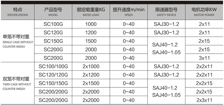 SC SERIES POWER FREQUENCY CONVERSION DUAL CONTROL Rated speed: 0-40 m / min SC new general hoist: 1. Energy saving, small start up current. 2. Adjustable speed, more convenient operation. 3. Starting and braking smoothly. 4. Reduce mechanical wear and mechanical service life extension. 5. The running status of building hoist can be tracked from the monitor panel.